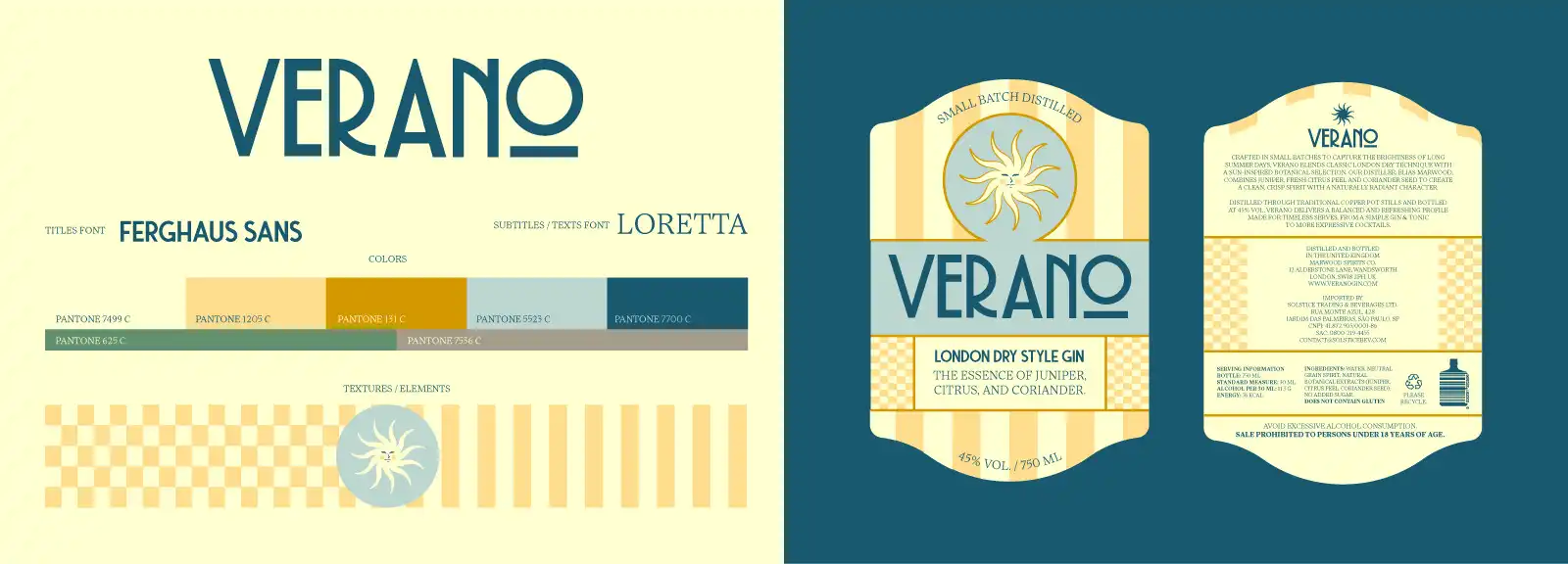 Verano Gin nasceu da ideia de que o verão é um estado de espírito, não apenas uma estação. A marca propõe um verão mais lento, sensorial e contemplativo, pensado para um público jovem, urbano e criativo que se interessa por design, fotografia, moda e cultura visual, e valoriza experiências cuidadosamente selecionadas, rituais simples e objetos com propósito. Em um mercado saturado de narrativas técnicas e códigos de sofisticação repetitivos, o principal desafio do projeto foi traduzir essa atmosfera de calma, leveza e presença em um rótulo que se destacasse sem recorrer a excessos.
